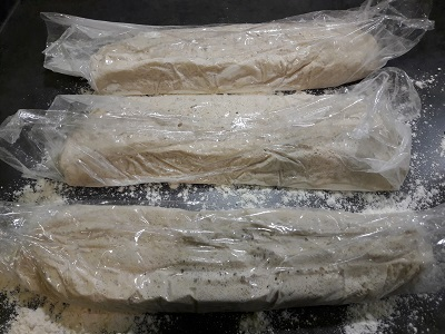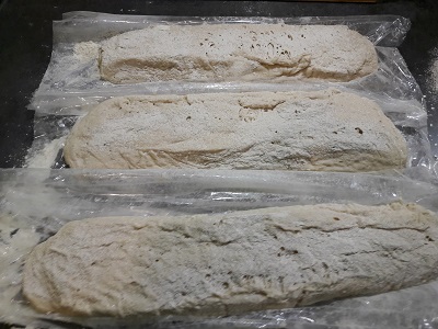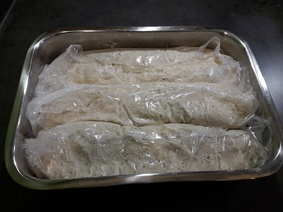 Die Teigrohlinge großzügig in gut bemehlte Frischhaltefolie einschlagen und mit der Foliennaht nach oben eng nebeneinander in eine längliche Form / Schüssel o. ä. setzen. Abgedeckt 1 Stunde bei Zimmertemperatur und danach etwa 12 Stunden lang (am besten über Nacht) im Kühlschrank ruhen lassen.