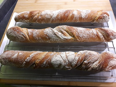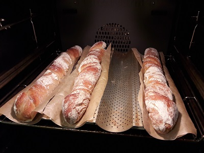 10 Minuten auf Temperatur backen, dann den Ofen auf 200 Grad runterschalten und die Baguettes in weiteren 20 – 25 Minuten fertig backen, dabei die Ofentür in den letzten 5 Minuten leicht öffnen.