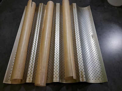 Zum Backen nutze ich gerne mein Baguettebackblech. Das hat den Vorteil, dass der Teig an der Seite nicht auseinander läuft und die Brote in Form bleiben. Zusätzlich schneide ich mir ein paar Streifen Backpapier zurecht mit deren Hilfe ich die weichen Rohlinge gut auf das Blech hieven kann und festbrennen / anbacken verhindert wird.