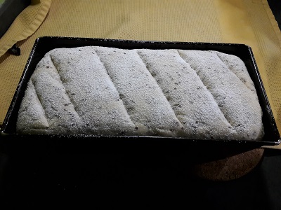 Jetzt sollte der Ofen schon mal auf 220 Grad Ober-/Unterhitze vorgeheizt sein, denn es fehlen nur noch ein paar Einschnitte auf der Teigoberfläche mit einem scharfen Messer und eine kleine Mehlberieselung für die Optik, bevor das Kunstwerk in den Ofen kommt:
