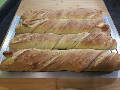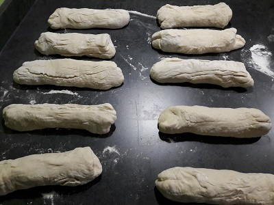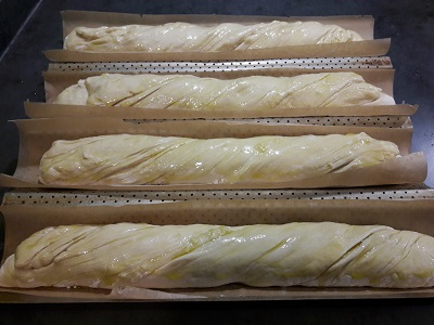 Die Rohlinge zieht ihr erst in eine längliche Form, nehmt dann in jede Hand ein Ende und dreht sie, wie eine Kordel. Anschließend kommen die Teile auf ein mit Backpapier bedeckten Gitterrost oder eine spezielle Baguette Form (Mein Favorit!).