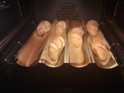 Jetzt backt ihr sie 10 Minuten bei 250 Grad an, dabei schwadet ihr 2 x den Ofen (Einfach eine mit Wasser gefüllte Blumenspritze reinhalten und ein paarmal den den Abzughahn ziehen).