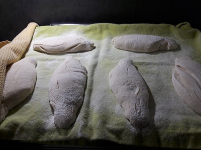 Nach der Gehzeit legt ihr eure Teiglinge vorsichtig auf ein mit Backpapier belegtes Blech (Ich nehme dazu ein spezielles Baguetteblech) und schneidet sie 2x schräg ein.