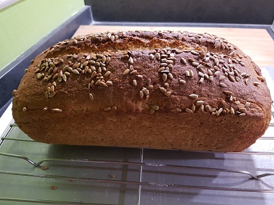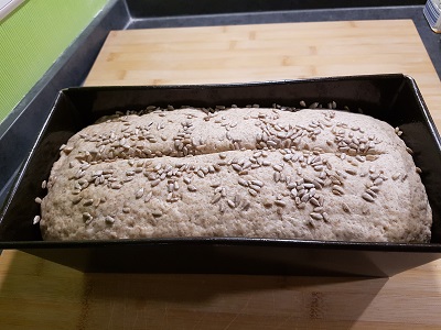 Den Teig mit etwas Wasser besprühen, ein paar Körner drauf (hier Sonnenblumenkerne) und für ca 50 Minuten ab in den Backofen!