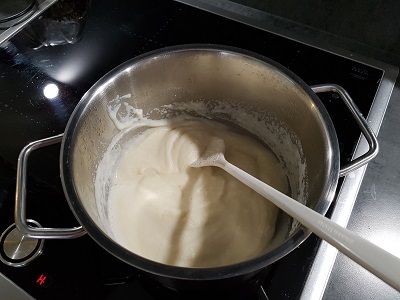 …erstmal kochen wir wieder Brei (Pams) mit 75 g Hartweizengrieß, 375 ml Milch mit einer Prise Salz – aber ohne Zucker: