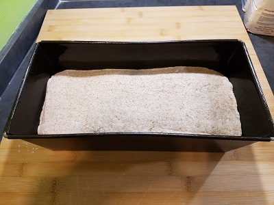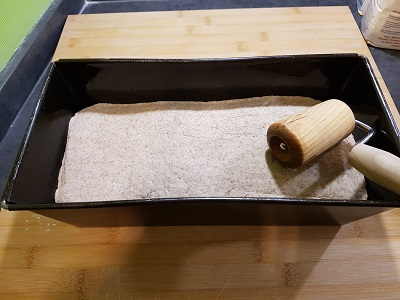 Jetzt nochmal mit der Hand durchkneten, oval formen und dann in eine gefettete oder geölte Backform geben: