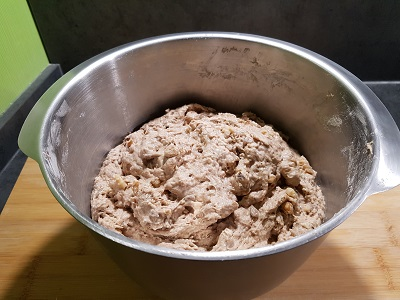Das Mehl abwiegen und in „the machine“ geben. Kurz durchlüften und dann nach und nach die Zutaten hinzufügen. Ich fange mit den Walnusskernen an, dann den „Haferblumensonnenschleim“ und zum Schluss die Hefelösung. Alles gut durchmengen, so dass die Pampe am Ende etwa so aussieht: