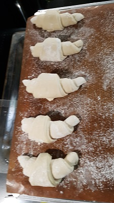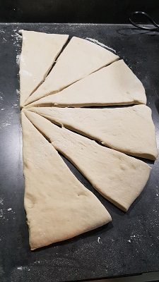 Am Abend vor dem Backen die Hefe mit dem Zucker in der kalten Milch verquirlen. Mehl mit Salz und Backmalz vermischen und mit der Hefemilch 10 Minuten zu einem nicht zu festen Hefeteig verkneten. Den Teig dann abgedeckt bei Zimmertemperatur ca. 45 Minuten ruhen lassen. Noch mal kräftig durchkneten und zu einem Kreis von 0,5 cm Dicke ausrollen. Den Kreis in 12 Tortenstücke teilen und diese vom dicken Ende aus aufrollen und zu Hörnchen formen: