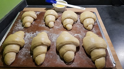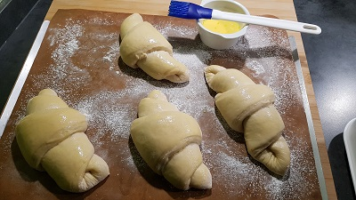 Am nächsten Morgen nehmt ihr das Backblech aus dem Kühlschrank. Dann ein Eigelb mit 3 El. Milch verquirlen und die Hörnchen damit bestreichen.