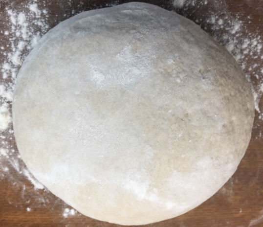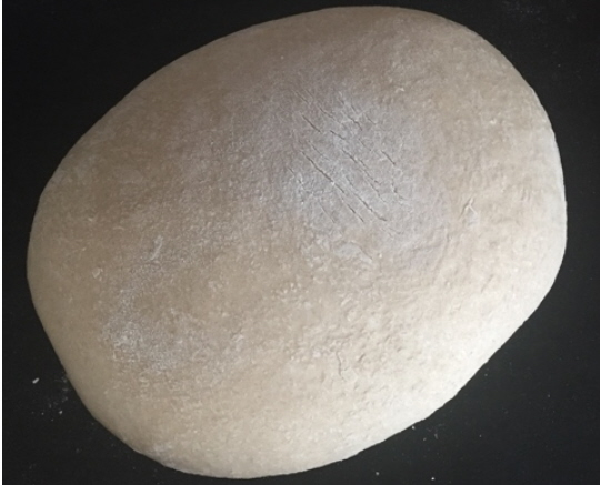 Jetzt ist er fällig, der Kumpel, ein paarmal falten und etwas in die Länge wirken, so dass er augenscheinlich gut auf das vorbereitete Backblech mit Backpapier passt. Ich persönlich lege eine Dauerbackfolie auf einen Holzschieber, bestreue die Folie mit etwas Mehl und setze den Teigrohling da drauf.