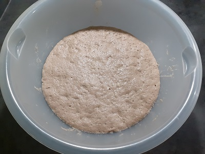 Für den Sauerteig vermischt ihr alle drei Zutaten gut und lasst sie dann in einer Schüssel abgedeckt an einem warmen Ort ungefähr 12 – 16 Stunden reifen! Ich nutze dafür immer eine tragbare Salatschüssel mit Deckel – der ist luftdurchlässig, so dass der Reifeprozess gut funktionieren kann. Die Schüssel stelle ich dann einfach in den kalten Backofen oder, wenn dieser noch anderweitig gebraucht wird in die warme Waschküche.