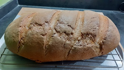 Abschließend das fertige Brot auf einem weiteren Gitterrost außerhalb des Ofens ablegen, nochmal mit etwas Wasser besprühen und mit einem Tuch bedeckt abkühlen lassen.