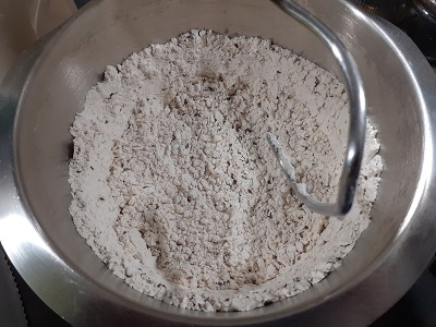 1. Alle Mehlsorten und kernigen Zutaten in die Rührschüssel geben und schon mal etwas vermischen.