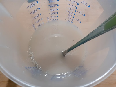 2. Hefe in kleine Stücke bröseln und in einem Messbecher oder ähnlichen Gefäß mit dem Salz und dem Zucker so lange vermengen bis sich die Hefe aufgelöst hat – anschließend mit dem lauwarmen Wasser ordentlich verrühren.