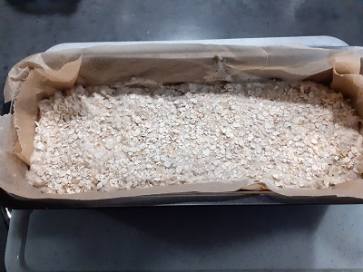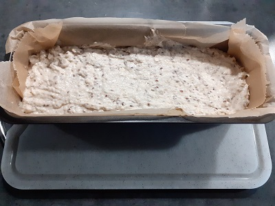 4. Jetzt kommt die ganze Masse in die vorbereitet Kastenform und wird dort verteilt und mit etwas Wasser und einem Löffel, Spachtel o. ä. Werkzeug glatt gestrichen.